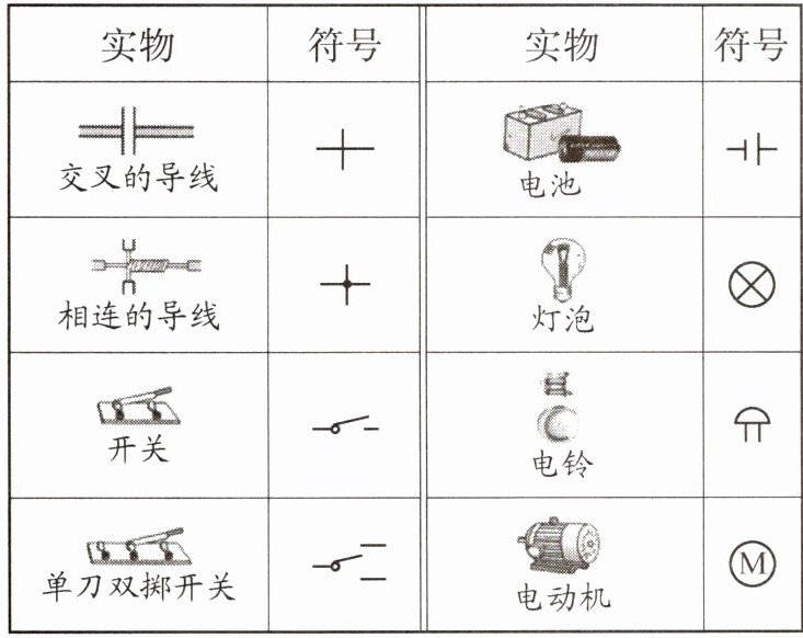 ,这时用电器不能正常工作,而且会烧坏电源,甚至造成火灾。3. 物理学中常用实物图和电路图来表示电路。电路图是指用规定的电路图形符号来表示电路连接。请将下表补充完整: