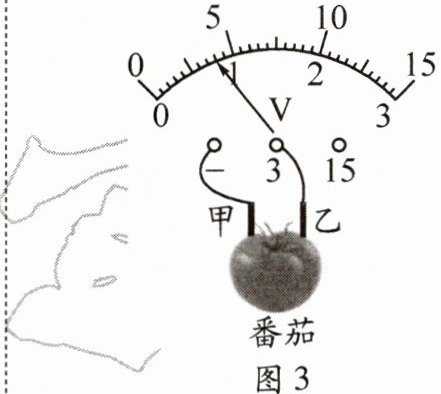 5. (2023·漳州)在一个番茄上相隔一定距离分别插入锌、铜金属片,可做成“番茄电池”,让“番茄电池”与已调零的电压表相连,指针偏转情况如图3所示。由此可知,甲片是“番茄电池”的