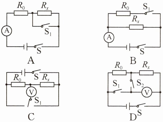 ( C )6. (2022·绥化)下列电路中,电源电压保持不变且未知,$R_0$是已知阻值的定值电阻。在实验中不拆改电路的情况下,不能够测量出未知电阻$R_x$阻值的电路是