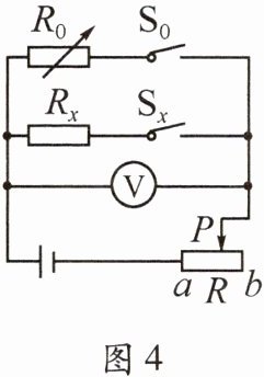( C )4. 某同学设计了图4所示的电路测量未知电阻$R_x$的阻值,其中电源电压保持不变,$R_0$为变阻箱,R是滑动变阻器。下列实验操作正确的是