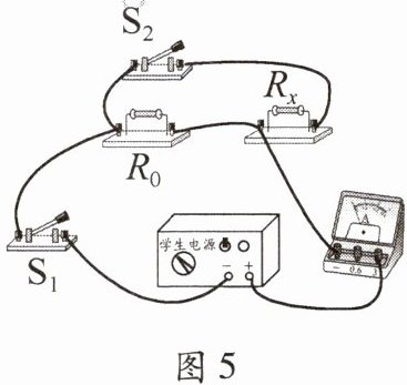 ( D )5. 小阳想利用一个电流表和阻值已知的电阻$R_0来测量电阻R_x$的阻值。他选择满足实验要求的电源、电流表,并连接好了实验电路,如图5所示。闭合开关$S_1$、$S_2$,读出电流表的示数为$I_1$;闭合开关$S_1$、断开开关$S_2$,读出电流表的示数为$I_2$。下列关于$R_x$的表达式正确的是