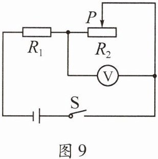 9.(2023·柳州)如图9所示,电源电压保持不变$,R_1= 20Ω。$闭合开关S,当滑动变阻器$R_2$的滑片P处于中点时,电压表的示数为6V;当将滑动变阻器的滑片P移到最右端时,电压表的示数为8V。(1)滑动变阻器的最大阻值为多少?(2)电源电压为多少?_____
