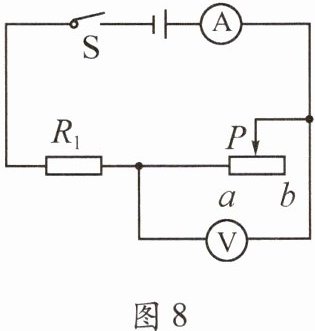 8.(2023·长沙)如图8所示,电源电压保持不变,闭合开关S,移动滑片P改变滑动变阻器接入电路的阻值,使电压表的示数从6V变化到9V,同时观察到电流表的示数从2A变化到1A。由此可得,定值电阻$R_1$阻值和电源电压分别为 (