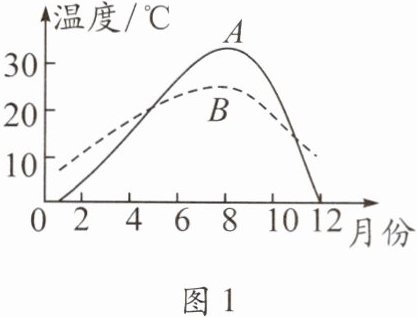 2.如图1所示是某一内陆城市与某一沿海城市的年气温变化曲线。由图象可以看出,在一年中,曲线A所示的城市气温变化较
