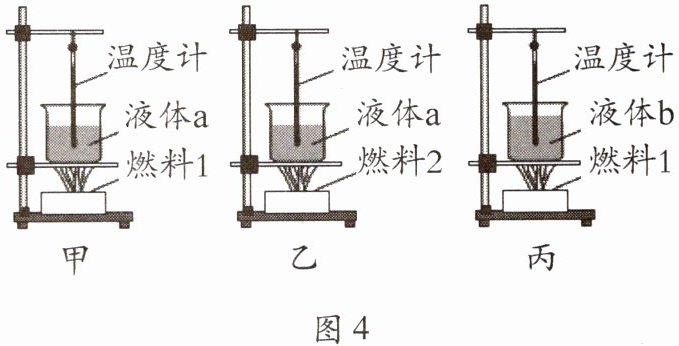 12.如图4所示,甲、乙、丙三个装置完全相同,所用燃料的质量相等,烧杯内的液体质量初温和初温也相同。