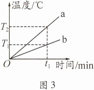 11.如图3所示是根据“探究不同物质吸热能力”实验所得数据绘制的a、b物质的温度-时间图象。实验中两种物质的质量相同,初温相同,选用的加热器相同。由图象可知,下列判断正确的是 (