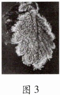 大量热,使容器内的温度降至-30℃以下。通入高温水蒸气,一段时间后,看到树叶上出现了厚厚的白霜,如图3所示,这是凝华
