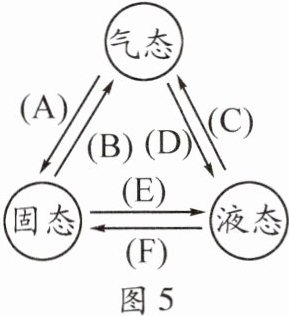 4. 如图5所示,A、B、C、D、E、F分别表示一种物态变化,有下列物态变化现象:①晾在室外的湿衣服变干了;②夏天,从冰箱里拿出的冰矿泉水瓶,瓶外出现水珠;③冬天,河面上结了一层冰;④放在衣柜里的樟脑丸会越来越小,最后“消失”了;⑤冬天,洗热水澡时,浴室的镜子上出现水雾;⑥北方寒冷的冬天,雪人“变矮”了。其中,B物态变化是