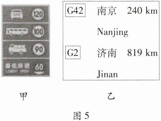 13.在沪宁高速公路入口处有如图5甲所示的标志牌,当小明乘坐旅游大巴经过如图5乙所示的标志牌时,下列说法正确的是 (