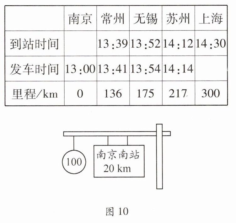 11. 爸爸带小明驾车去南京南站,然后乘高铁(G7013次高速列车时刻表如下表)去上海。驾车途中,小明发现一个交通标志牌如图10所示。