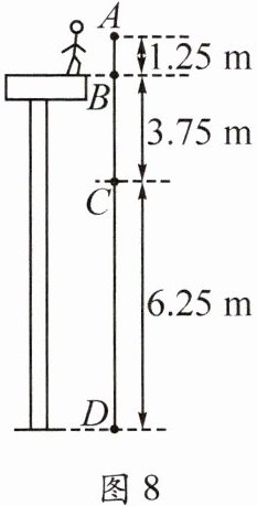 9. 我国运动员全红婵,在2023年世界泳联跳水世界杯西安站女子单人10米跳台预赛中,出色地完成了“207C”动作。将她下落阶段中的一段运动简化为直线运动,其中A、B、C、D四点是她下落过程中的四个位置,相邻两点间的时间间隔为0.5 s,距离如图8所示。在此段运动过程中,下列判断正确的是( )