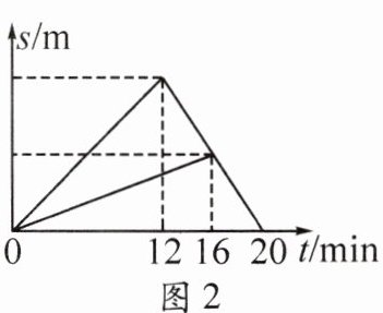 4. 刘明与王超住在同一个小区,周末他们要去同一个电影院看电影。他们沿相同的路线同时从小区大门口出发,刘明走路,王超骑自行车。王超以4 m/s的速度骑车用时12 min到达电影院时,却发现电影院关门了,于是他立即沿原路返回。又过了4 min他遇到正在走路的刘明,于是载着刘明一起回家了。王超从小区出发到返回一共用时20 min,图2所示是他们的路程与时间图象。下列说法正确的是(