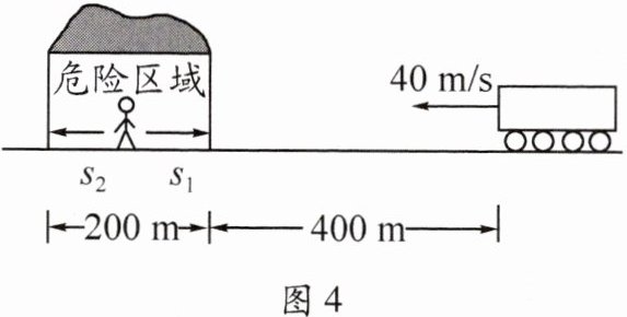 6. 如图4所示,某轨道工在长为200 m的隧道中巡查时,突然发现一列火车出现在离隧道右侧入口400 m处,轨道工立即以恒定的速度跑离隧道。已知火车行驶的速度为40 m/s,若轨道工发现火车时,自己处在无论向左跑还是向右跑,都恰好能够跑离隧道危险区域的位置。则该位置到隧道右侧入口的距离$s_{1}$是多少m?