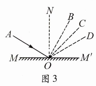2. 如图3所示,MM'为平面镜,AO为入射光线,ON为法线,入射光线与平面镜的夹角为∠AOM=30°,则入射角大小为