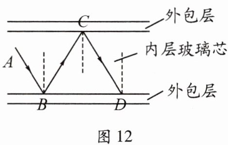 2. 光在玻璃纤维中的传输情况是光线每次由内层玻璃芯射向外包层的分界面时,均要发生反射,从而使光在不断地反射中沿内层玻璃芯向远处传播。如图12所示,当增大入射光线AB的入射角时,下列说法错误的是 (