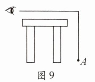 14. 如图9所示,实线是人眼看到A点的光的路径,请在图中标出光的传播方向并画出平面镜应摆放的位置。
