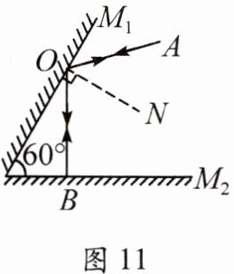 1. 如图11所示,平面镜M₁和M₂的夹角是60°,若光线经M₁和M₂反射后按原路返回,则∠AON为 (