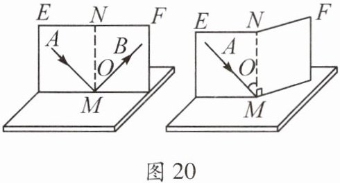 14. 为了探究光的反射规律,小明用如图20所示的装置进行实验。实验中,他将平面镜置于水平桌面上,把一块可沿ON折叠的白色硬纸板竖直放置在平面镜M上。
