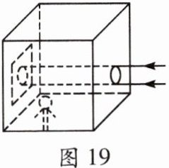13. 如图19所示,正方形不透光的房间的一面墙上开有一个圆形小孔,在这面墙的对面有一块正方形的平面镜。在房间里,有一个人靠在与平面镜垂直的一侧墙面上。当一束垂直于圆孔的平行光通过圆孔射到平面镜上时,不考虑空气中的尘埃反射,他能看到的是 (
