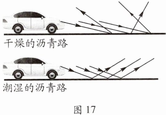 10. 图17所示是晚上汽车分别在干燥的沥青路面上和潮湿的沥青路面上行驶时大灯的部分光路简图。在晚上开车时,下列说法正确的是 (