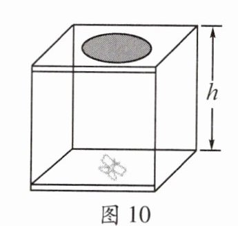 11. (2022·河南)小明用透明塑料盒设计了一个昆虫标本观察器,如图10所示。在盒底放标本,再在盒盖上嵌入一凸透镜。有焦距分别为5cm和10cm的两种凸透镜,为了在盒盖上方附近,透过凸透镜观察到标本正立、放大的像,则凸透镜的焦距f与盒高h的合理选择是 (