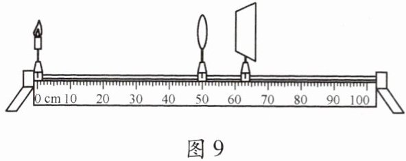 10. (2023·江西)某同学探究凸透镜成像规律时,在光屏上得到了烛焰清晰的像(像未画出),如图9所示。下列说法正确的是 (