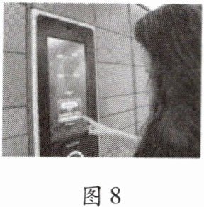 9. (2023·黄冈)图8所示是超市里安装的一种刷脸自助储物柜。顾客站在屏幕前50cm处,按下“存”按钮,屏幕上方的摄像头启动,出现人脸缩小的像,柜门打开。下列说法正确的是 (