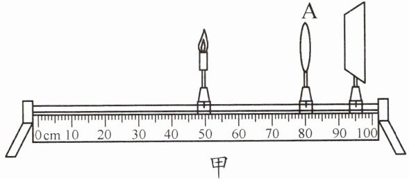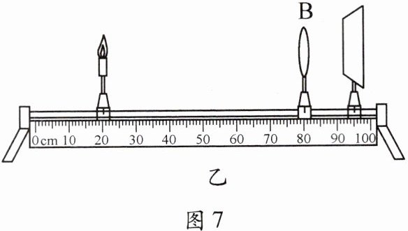 (1)实验前,要调整烛焰、凸透镜和光屏的中心大致在同一 。(2)适当调整凸透镜A和光屏的位置,移动蜡烛,使烛焰在光屏上成清晰的像,如图7甲所示;然后他将凸透镜A换为焦距稍大的凸透镜B,并保持凸透镜和光屏位置不变,移动蜡烛,使烛焰在光屏上再次成清晰的像,如图7乙所示,此时光屏上的像 (选填“大于”“小于”或“等于”)图7甲中光屏上的像。(3)小虎发现,当人眼看近处物体时,晶状体的焦距 (选填“变短”“不变”或“变长”);如果长时间处于此状况,人眼可能会失去调节功能,需要佩戴 透镜来矫正。