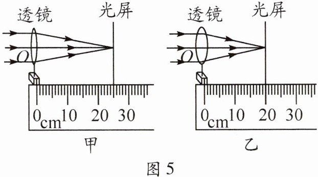 8. 有两个大小相同、厚薄不同的透镜,让一束平行光沿它们的主光轴照射,在另一侧放光屏并移动光屏,在光屏上得到最小、最亮的亮点。用刻度尺测出光屏上的亮点到透镜的距离,如图5所示。下列说法正确的是(