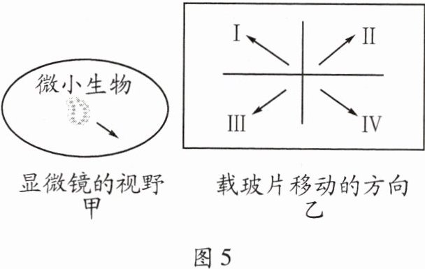 4.如图5所示,某同学用显微镜观察水中的微小生物,甲图表示显微镜视野中微生物的游走方向。为了不让该微生物从视野中消失,则载玻片移动的方向是乙图中的 (