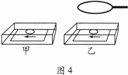 2.为了探究显微镜的工作原理,小明在白纸上画了一个红色箭头,然后把它放在高约为15 mm的透明塑料盒的下方,在盒的上方滴上一滴水,如图4甲所示,通过水滴(相当于凸透镜)可看到位于水滴下方的红色箭头放大的像。将一个焦距为30 cm的凸透镜放在水滴的正上方,如图4乙所示,保持凸透镜水平,调整凸透镜与水滴之间的距离,会看到箭头更大的像。关于该实验,下列说法正确的是 (
