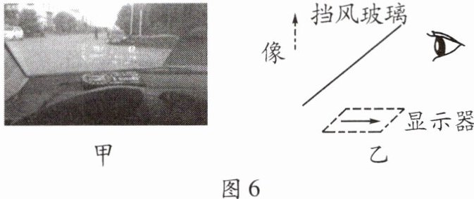 6. 为避免汽车在高速行驶时,驾驶员低头观看仪表信息而造成事故,人们发明了如图6甲所示的抬头显示器(HUD)。图6乙所示为其原理图,水平放置的显示器上行车数据能通过前挡风玻璃竖直呈现在驾驶员的正前方。下列判断正确的是(