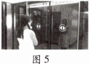 5. 如图5所示,某市民站在平面玻璃制的地铁安全门外候车。地铁列车到站后,安全门向两侧打开。关于该市民在左右两侧安全门中成像的情况,下列分析正确的是(