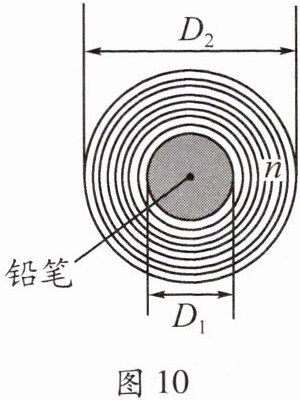 (2)为了测量一张纸的厚度,小夏用刻度尺测量得出桌上粗细均匀的铅笔的直径为D₁。他将厚薄均匀的这张纸紧密地环绕在圆柱形铅笔上并固定,测得其外径为D₂,如图10所示。纸带环绕了n圈,则纸带厚度d的表达式是