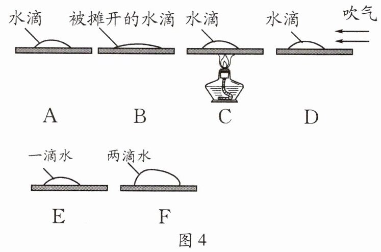 (4)某同学猜想水蒸发快慢还可能与水的多少有关,于是继续进行了如下探究:在相同环境中的两块相同的玻璃板上分别滴上一滴水和两滴水。如图中E、F所示,结果发现E图中的水先蒸发完,于是得出结论:“水蒸发快慢与水的多少有关,水越少,蒸发越快”。他的结论