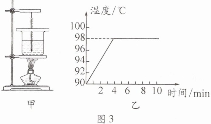 3. 在“探究水沸腾时温度变化的特点”实验中,小明用酒精灯将烧杯中90 ℃的热水加热到98 ℃时,烧杯内水中的气泡变化情况如图所示;继续加热,温度计的示数保持98 ℃不变。由此可以推断:此时烧杯中的水