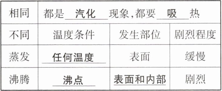 汽化; 吸; 任何温度; 沸点; 表面; 表面和内部; 缓慢; 剧烈