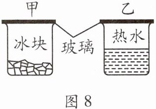 3. 如图所示,常温下的两个烧杯中分别盛有冰块和热水,两烧杯上方分别盖着玻璃甲和乙,过一会儿会看到的现象是 (