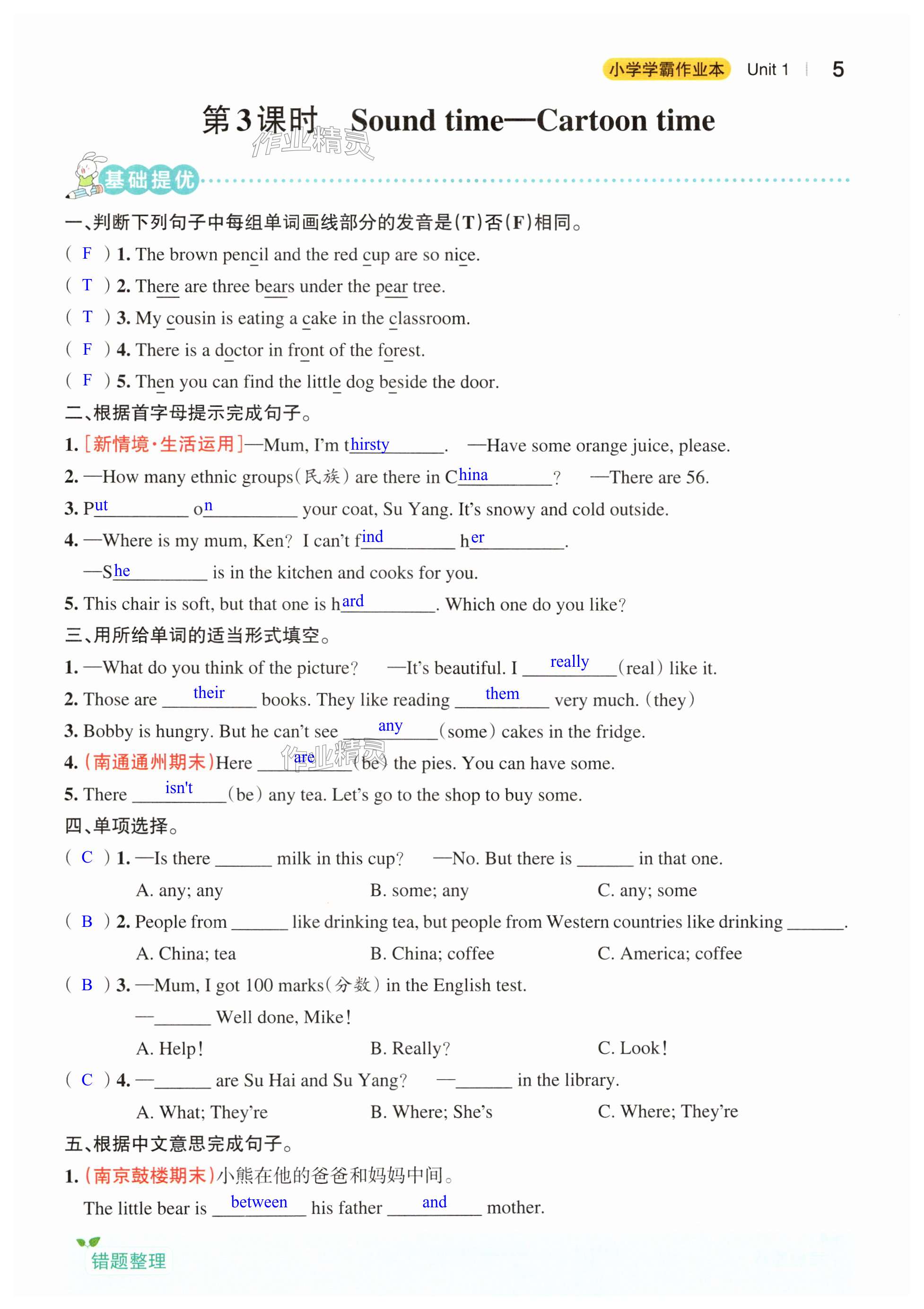 注:目前有些书本章节名称可能整理的还不是很完善,但都是按照顺序排列的,请同学们按照顺序仔细查找。练习册 2024年小学学霸作业本五年级英语上册译林版江苏专版 答案主要是用来给同学们做完题方便对答案用的,请勿直接抄袭。