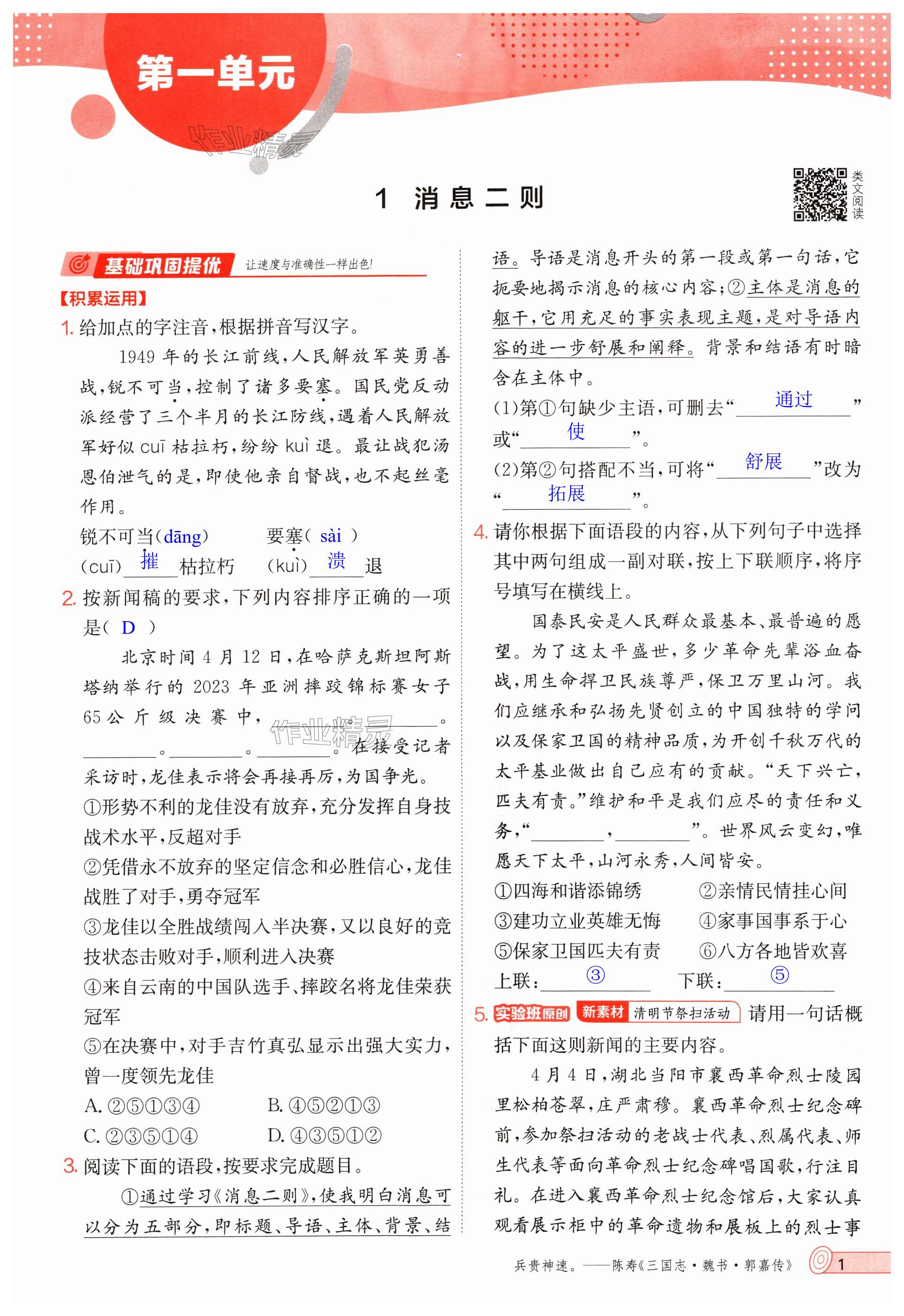 注:目前有些书本章节名称可能整理的还不是很完善,但都是按照顺序排列的,请同学们按照顺序仔细查找。练习册2024年实验班提优训练八年级语文上册人教版江苏专版答案主要是用来给同学们做完题方便对答案用的,请勿直接抄袭。