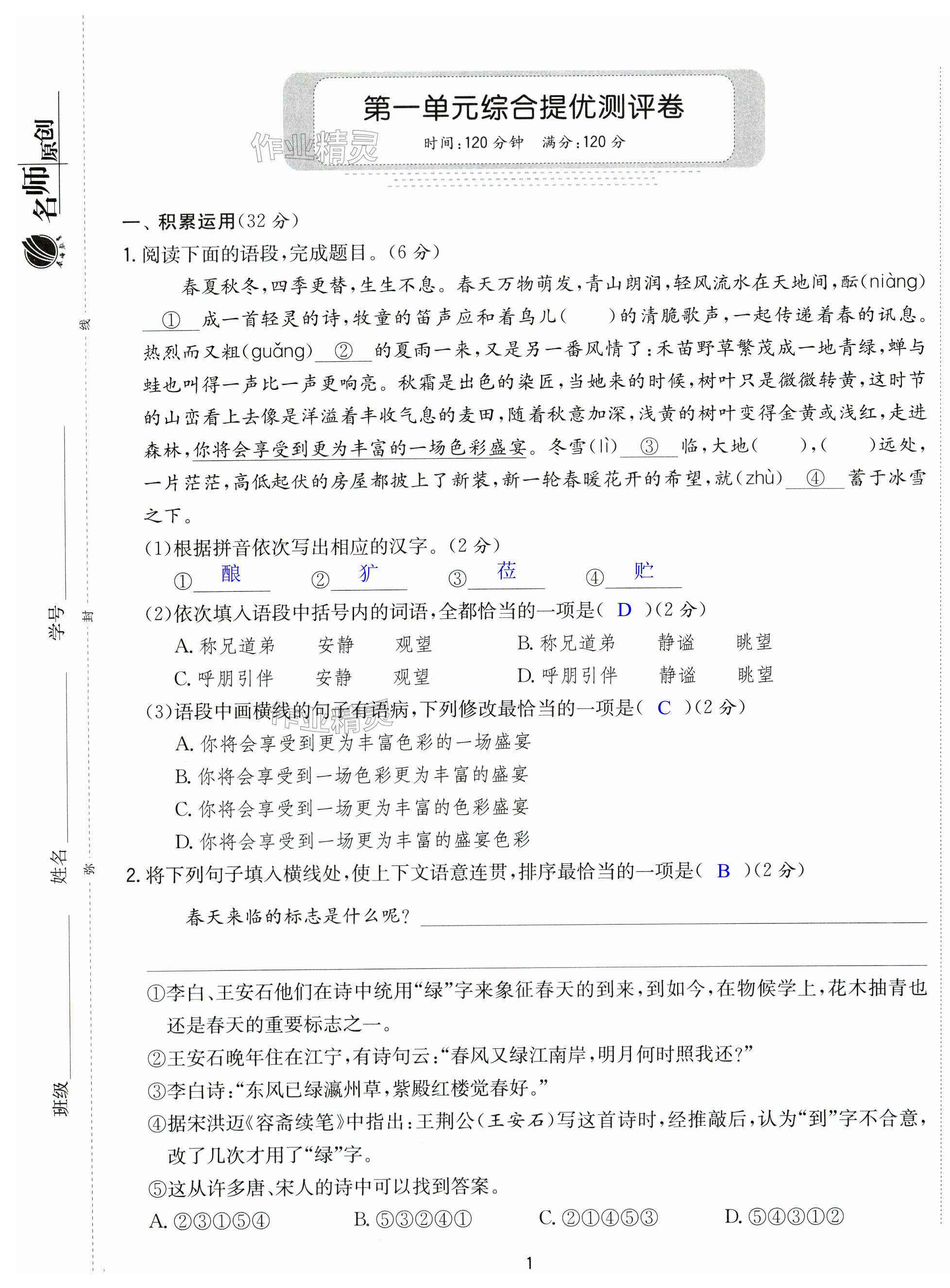 注:目前有些书本章节名称可能整理的还不是很完善,但都是按照顺序排列的,请同学们按照顺序仔细查找。练习册 2024年实验班提优训练七年级语文上册人教版江苏专版 答案主要是用来给同学们做完题方便对答案用的,请勿直接抄袭。