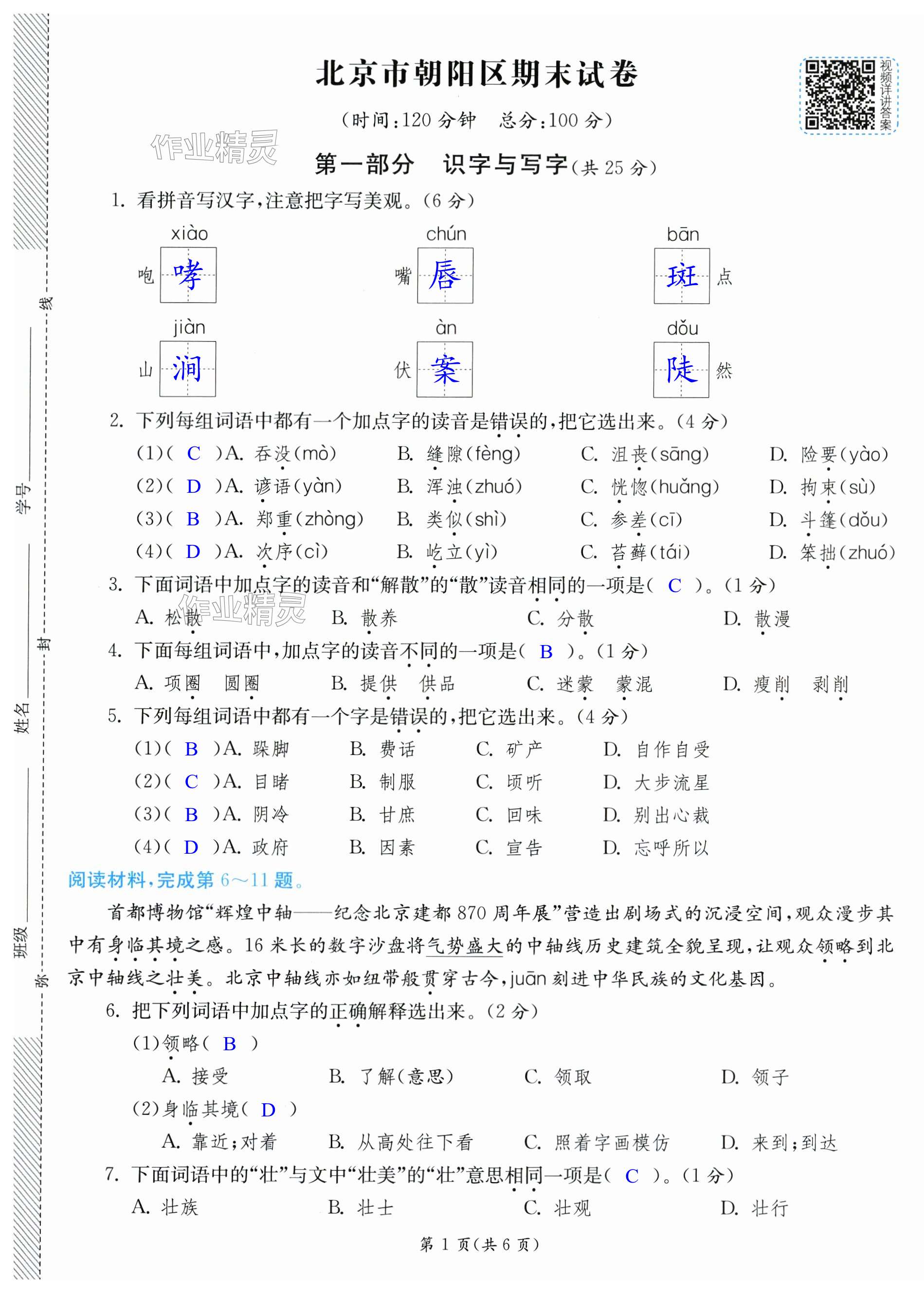 注:目前有些书本章节名称可能整理的还不是很完善,但都是按照顺序排列的,请同学们按照顺序仔细查找。练习册 2024年实验班提优训练六年级语文上册人教版 答案主要是用来给同学们做完题方便对答案用的,请勿直接抄袭。