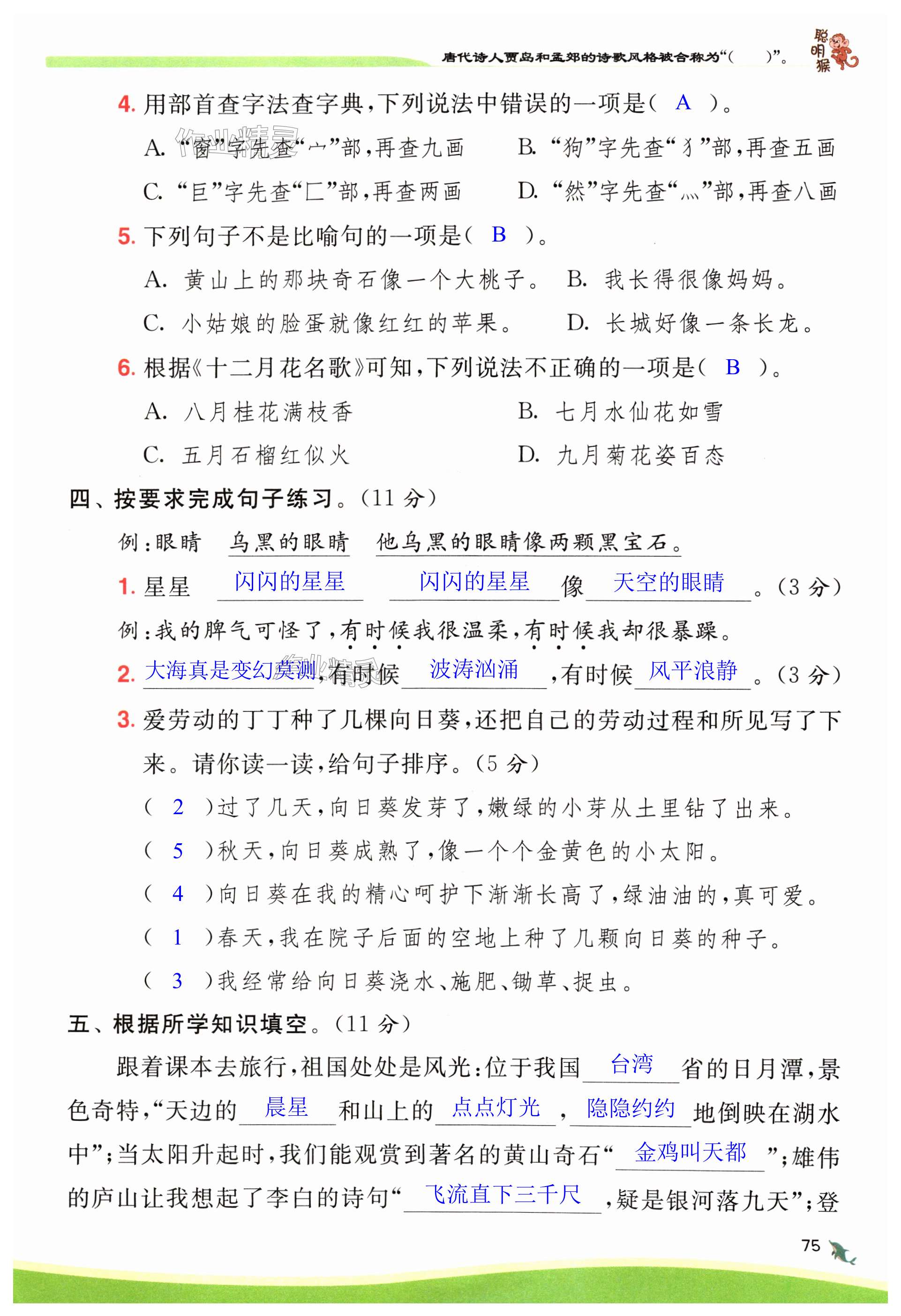 注:目前有些书本章节名称可能整理的还不是很完善,但都是按照顺序排列的,请同学们按照顺序仔细查找。练习册 2024年实验班提优训练二年级语文上册人教版 答案主要是用来给同学们做完题方便对答案用的,请勿直接抄袭。