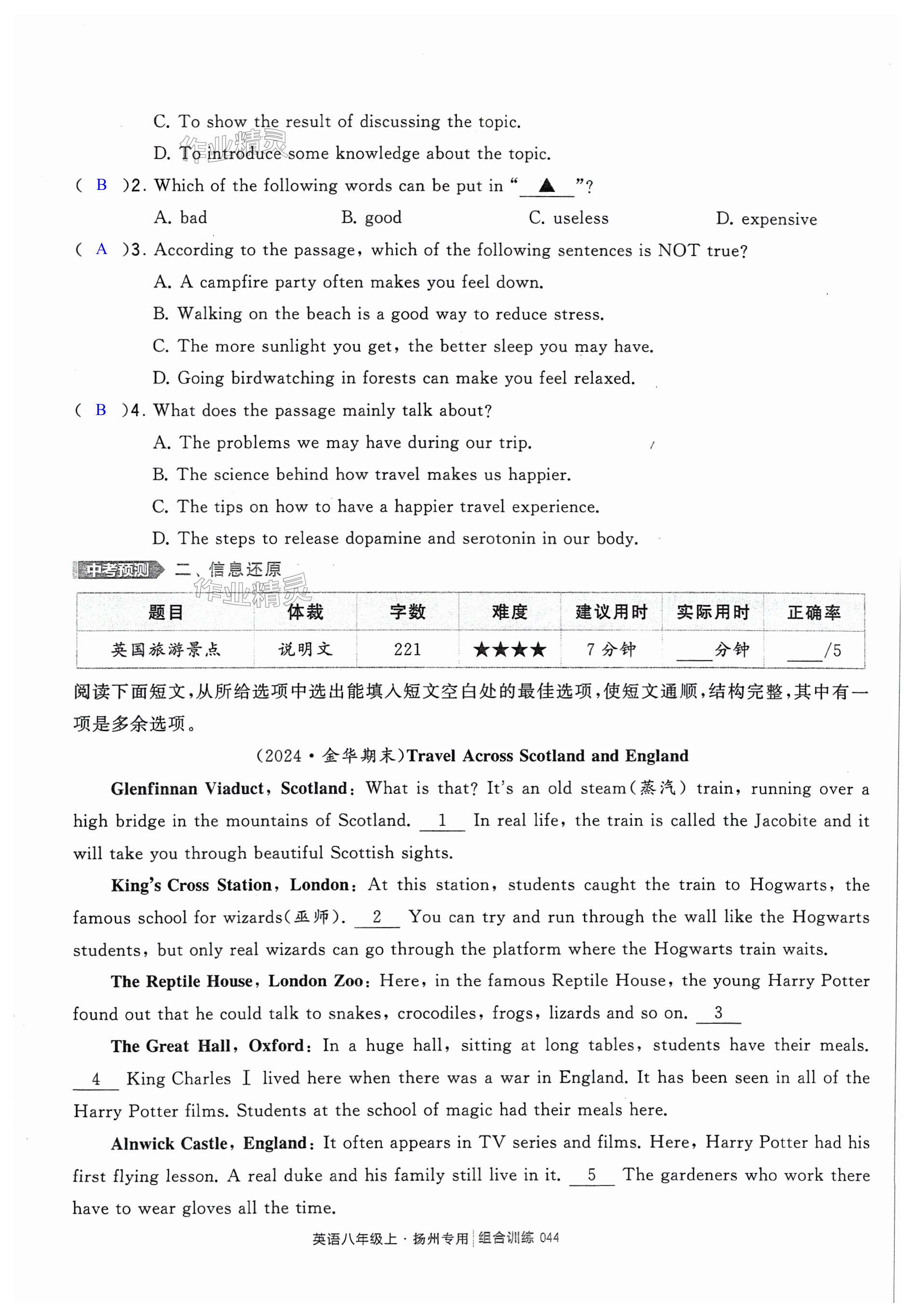 注:目前有些书本章节名称可能整理的还不是很完善,但都是按照顺序排列的,请同学们按照顺序仔细查找。练习册 2024年学霸组合训练八年级英语上册译林版扬州专版 答案主要是用来给同学们做完题方便对答案用的,请勿直接抄袭。