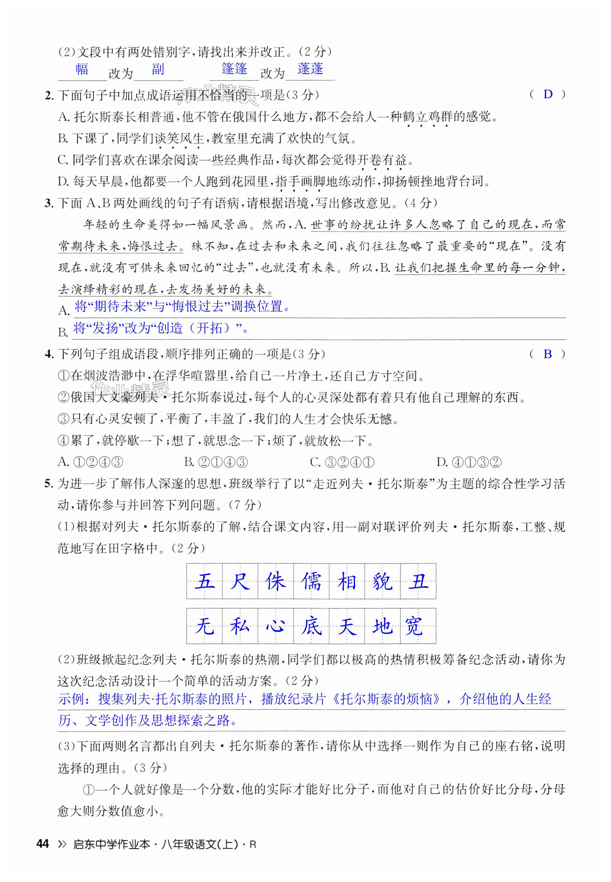 注:目前有些书本章节名称可能整理的还不是很完善,但都是按照顺序排列的,请同学们按照顺序仔细查找。练习册 2024年启东中学作业本八年级语文上册人教版 答案主要是用来给同学们做完题方便对答案用的,请勿直接抄袭。