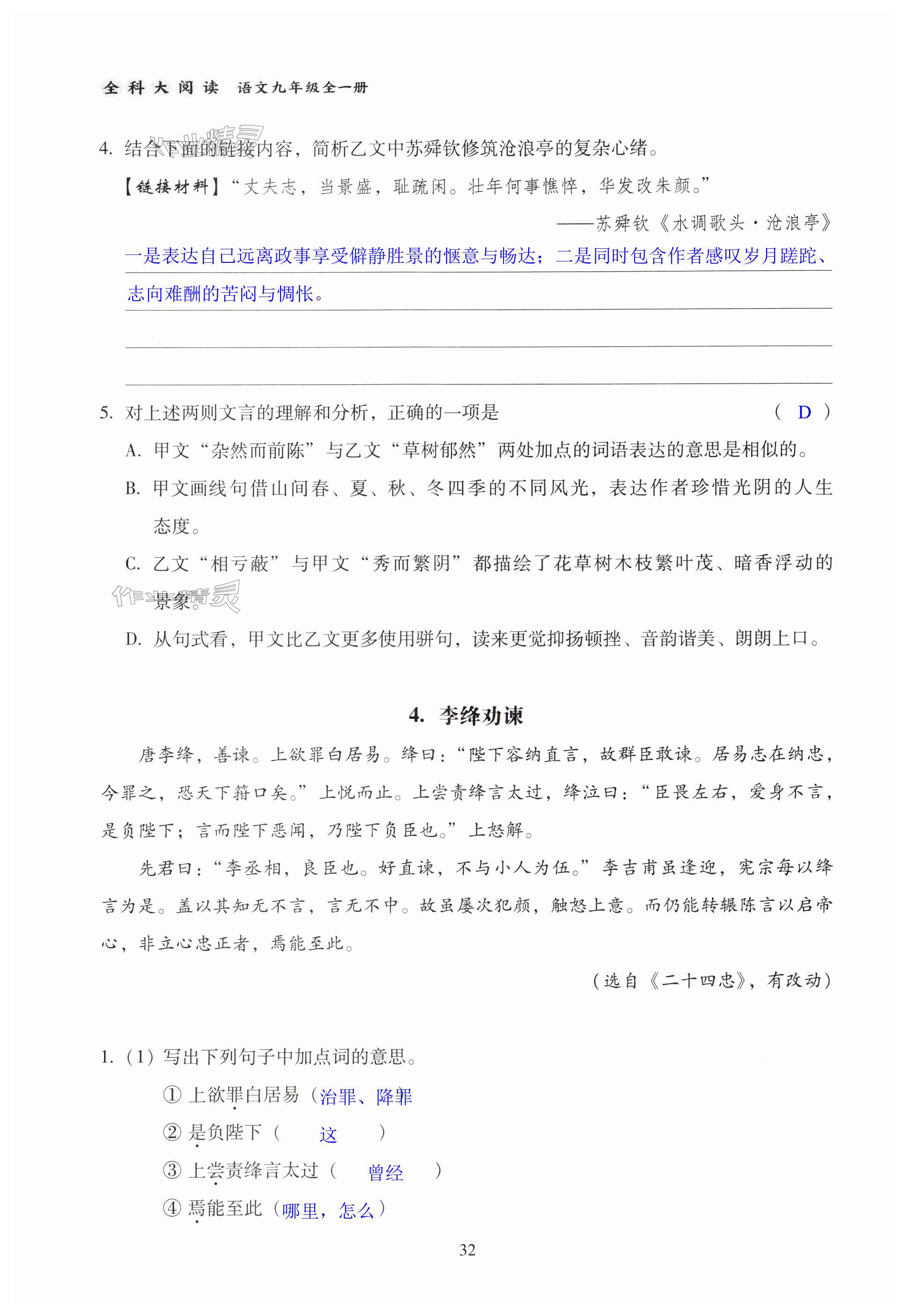 注:目前有些书本章节名称可能整理的还不是很完善,但都是按照顺序排列的,请同学们按照顺序仔细查找。练习册 2024年全科大阅读九年级语文全一册人教版 答案主要是用来给同学们做完题方便对答案用的,请勿直接抄袭。