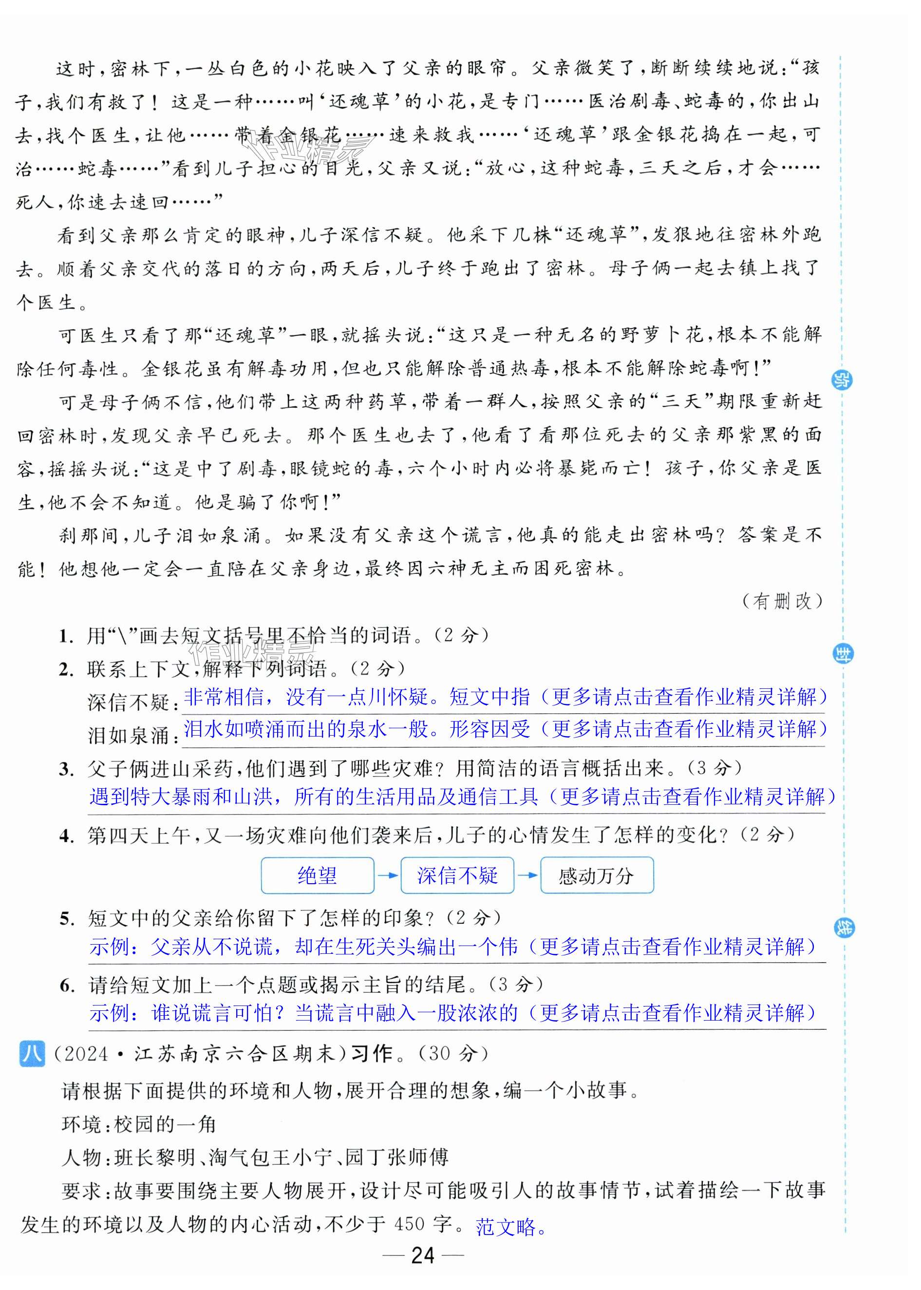 注:目前有些书本章节名称可能整理的还不是很完善,但都是按照顺序排列的,请同学们按照顺序仔细查找。练习册 2024年亮点给力提优班六年级语文上册人教版 答案主要是用来给同学们做完题方便对答案用的,请勿直接抄袭。