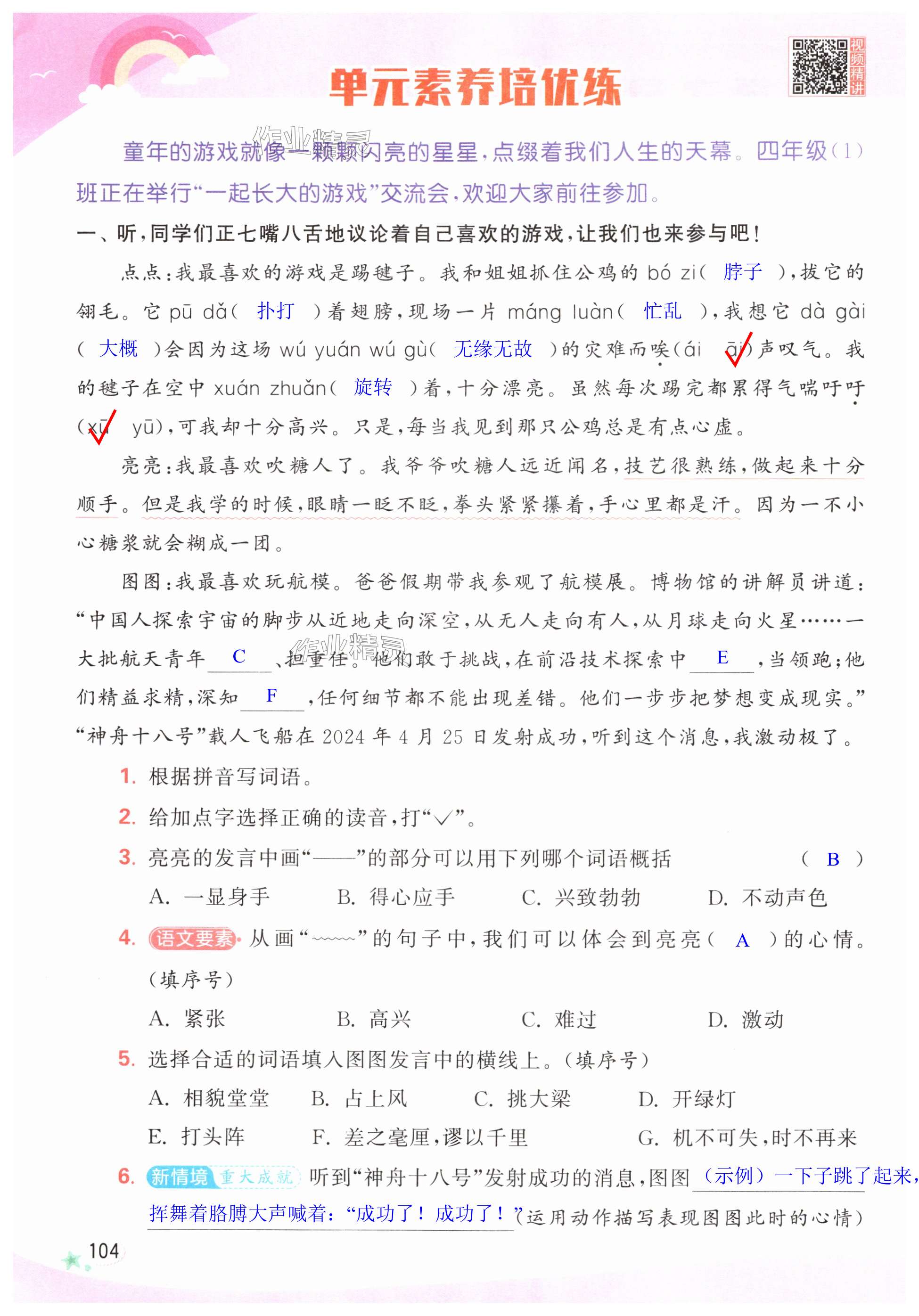 注:目前有些书本章节名称可能整理的还不是很完善,但都是按照顺序排列的,请同学们按照顺序仔细查找。练习册 2024年亮点给力提优班四年级语文上册人教版 答案主要是用来给同学们做完题方便对答案用的,请勿直接抄袭。