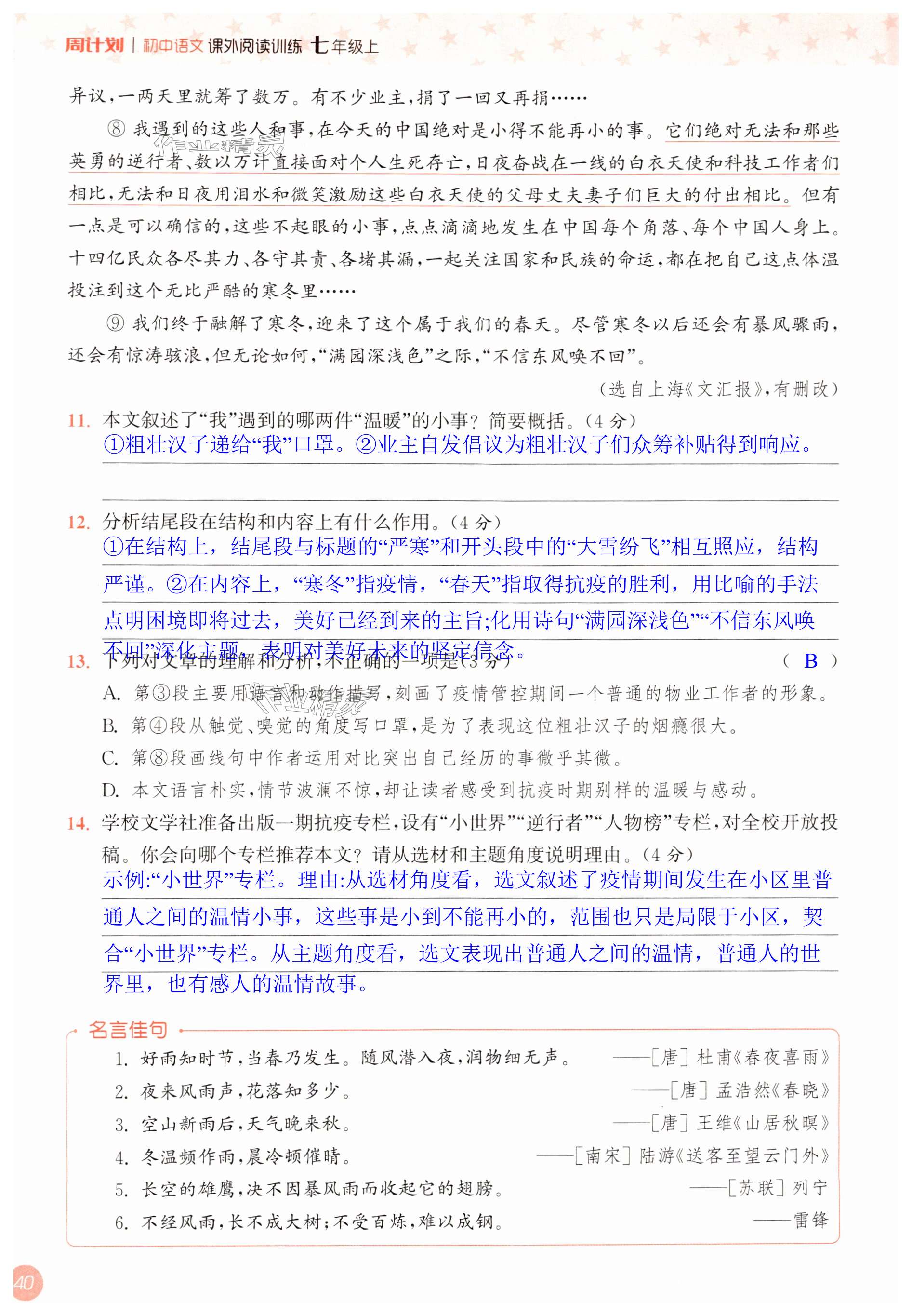 注:目前有些书本章节名称可能整理的还不是很完善,但都是按照顺序排列的,请同学们按照顺序仔细查找。练习册 2024年通城学典周计划课外阅读训练七年级语文上册人教版 答案主要是用来给同学们做完题方便对答案用的,请勿直接抄袭。