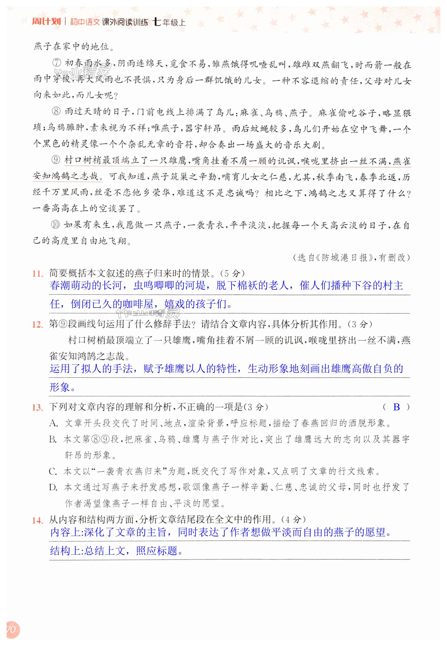 注:目前有些书本章节名称可能整理的还不是很完善,但都是按照顺序排列的,请同学们按照顺序仔细查找。练习册 2024年通城学典周计划课外阅读训练七年级语文上册人教版 答案主要是用来给同学们做完题方便对答案用的,请勿直接抄袭。
